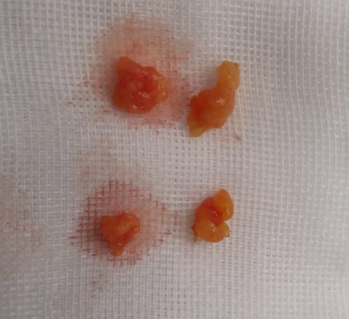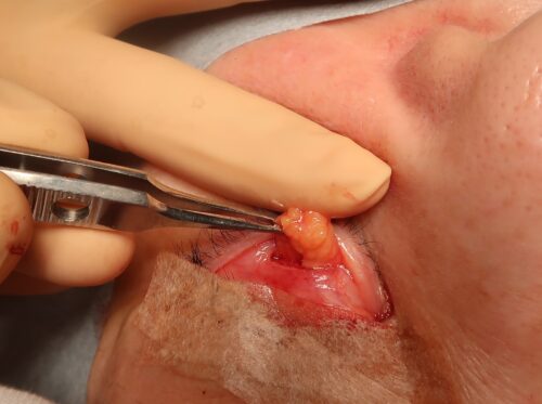 こんなかんじに結膜(赤目の部分)から眼窩脂肪を取り出します。